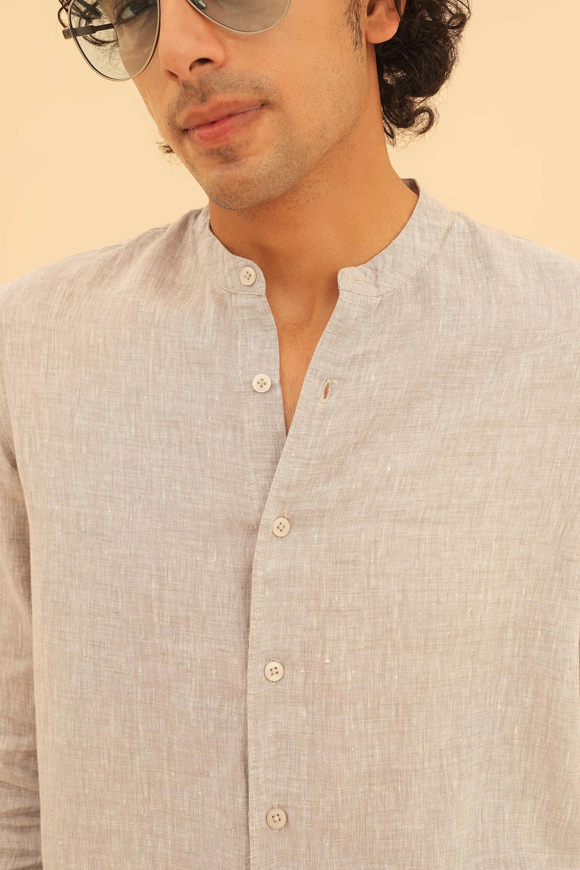 Designed with full sleeves, a mandarin collar, curved hem, every element is refined to maintain a clean, timeless silhouette. Dyed-to-match buttons complete the tone-on-tone finish for a sophisticated, minimal look.